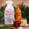 Wil je een fles alcohol mooi inpakken als kerstcadeau? Kies dan voor een elegant stoffen zakje van 16 x 37 cm. Hier bieden wij een wit satijnen zakje (1 st per verpakking) met een kleurrijke kerstprint waarop een glas warme glühwein is afgebeeld, samen met de karakteristieke accessoires en winterse specerijen voor glühwein - sinaasappelschijfjes, kaneel en anijs en het opschrift "Merry Christmas".