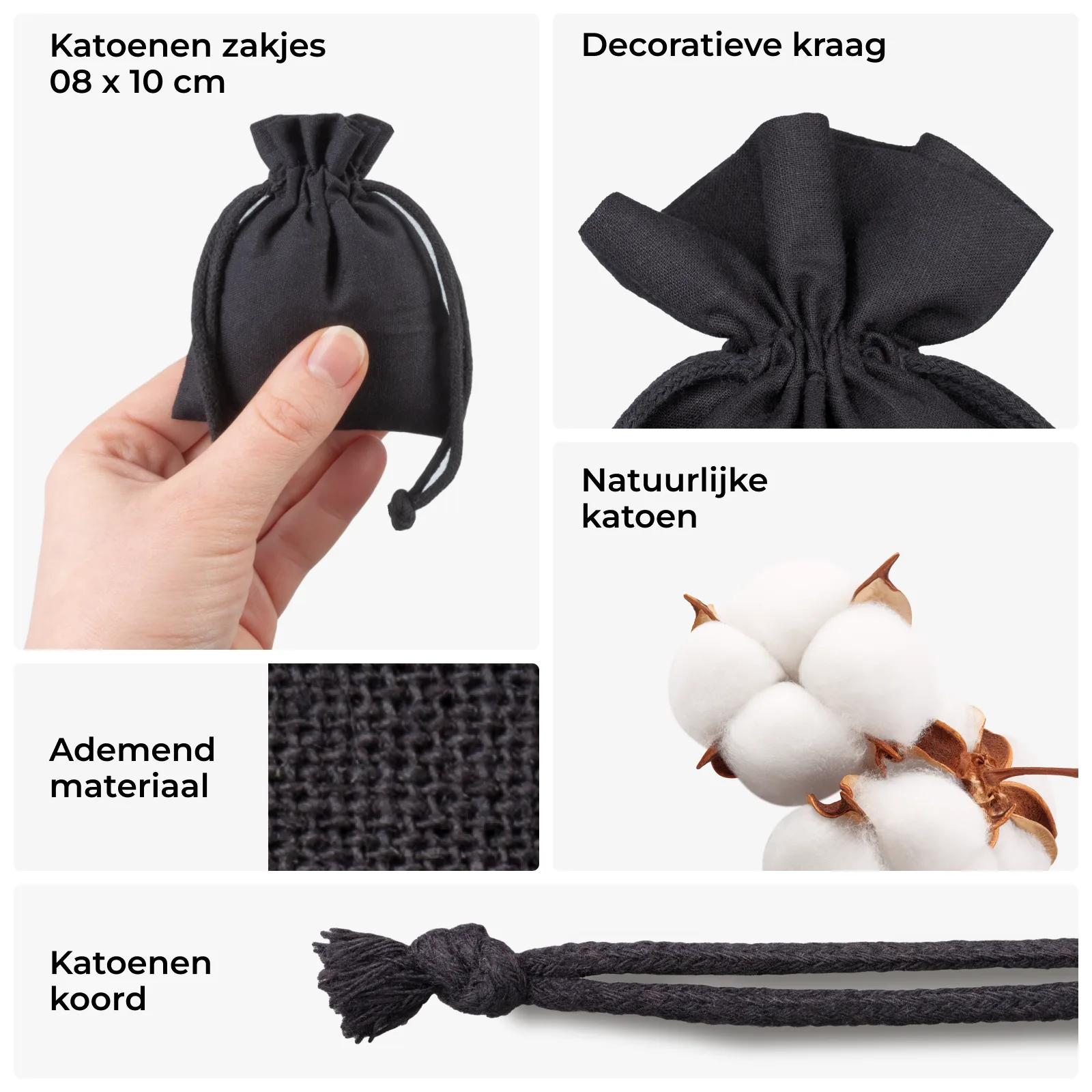 Kleine maar veelzijdige zakjes van elegant katoen in een zwart kleur in de maat 8 x 10 cm. Het gepresenteerde pakket bestaat uit 10 stuks, waardoor een eenmalige aanschaf van onze practische zakjes langer meegaat.