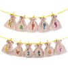 De Paas guirlande bestaat uit 11 jutezakjes van 12 x 15 cm in een natuurlijke lichte kleur. Elk tasje heeft een kleurrijke opdruk met enkele, decoratieve letters, de zakjes rangschikken zich samen in het opschrift : Happy Easter. Het geheel moet in twee rijen worden opgedeeld.