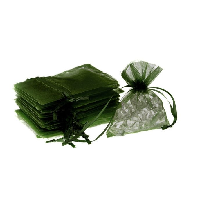 Een set van kleine organzazakjes met afmetingen 8 x 10 cm in de kleur olijf groen. Dit praktisch pakket bevat 25 stuks, waardoor een eenmalige aankoop langer meegaat.