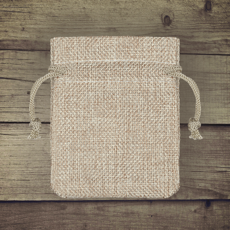 De zakjes zijn gemaakt van synthetische jute (100% polyester) met de typische geweven structuur van klassieke jute. De stof is vormvast, rafelt niet en blijft netjes, ook bij herhaald gebruik. De natuurlijke kleur past goed bij rustieke cadeauverpakkingen, handgemaakte producten en minimalistische branding. Dankzij de fijne textuur ogen de zakjes warm en ambachtelijk, terwijl het materiaal praktisch en duurzaam is.