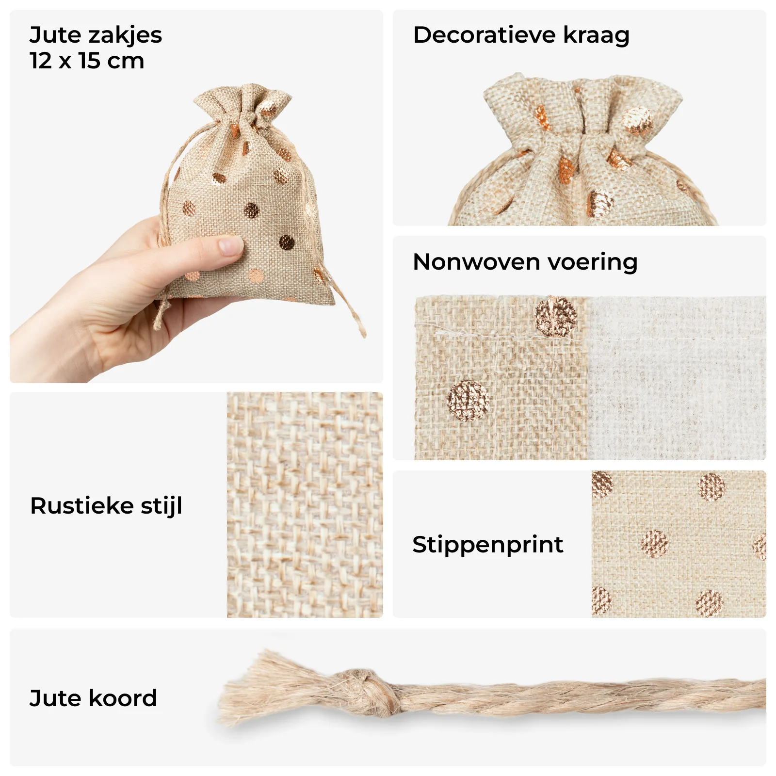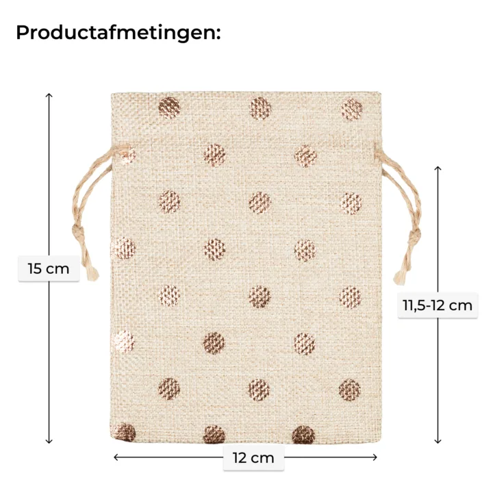 Zoek je een verpakking die natuurlijk aanvoelt, maar toch iets speciaals heeft? Deze jute geschenktasjes van 12x15 cm zijn een stijlvolle mix van landelijk design en moderne flair. Met hun subtiele goud-koperkleurige stippenprint tillen ze elke kleine verrassing of handgemaakt product naar een hoger niveau.