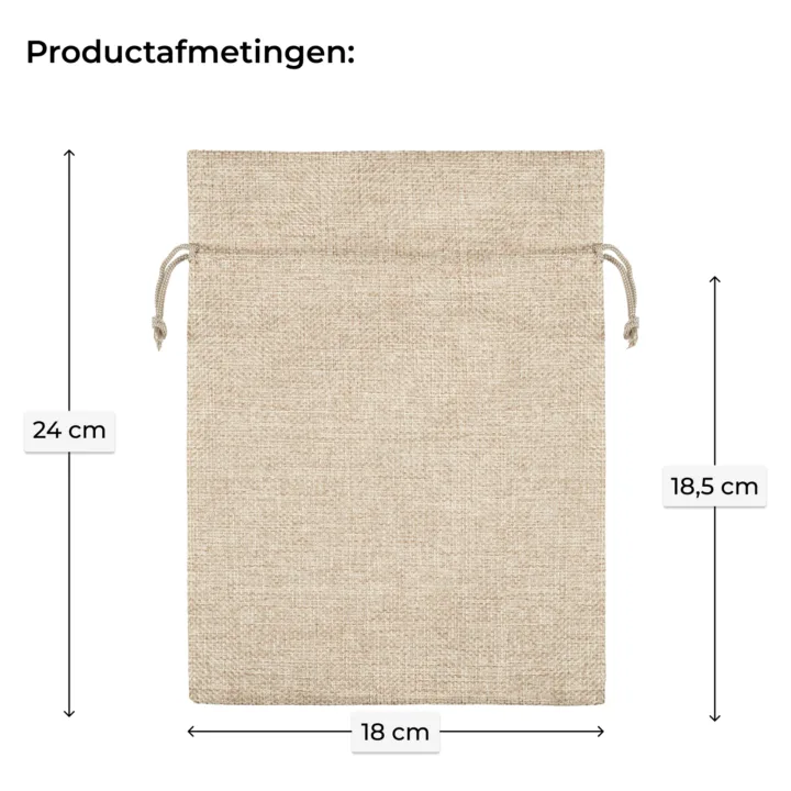 Onze jute zakjes van 18 x 24 cm zijn veelzijdige en elegante verpakkingen die zeer geschikt zijn voor veel toepassingen. Gemaakt van synthetische jute, ze zijn milieuvriendelijk en duurzaam, wat ze een perfecte keuze maakt voor zowel particuliere als zakelijke klanten.