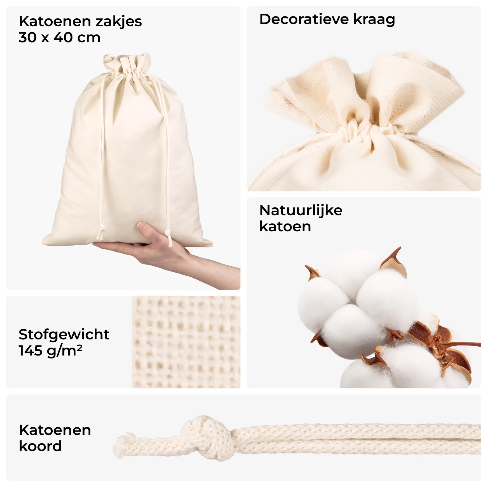 De katoenen zak 30x40 cm met trekkoordsluiting is een klassieker onder de duurzame verpakkingen. Gemaakt van 100% natuurlijk katoen (145 g/m²), combineert hij stevigheid met een natuurlijke uitstraling en veelzijdig gebruik. In de verpakking zit één grote zak met een decoratieve kraag boven de tunnel met trekkoord. De zak wordt gesloten met een dubbel katoenen koord voor een stevige en praktische sluiting.