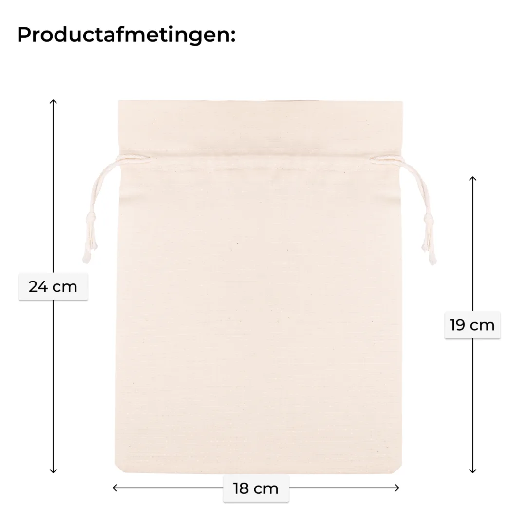 Deze katoenen zakjes van 18x24 cm combineren natuurlijke uitstraling met praktische functionaliteit. Gemaakt van 100% katoen met een gewicht van 145 g/m², voorzien van een stevig trekkoord, en geleverd in een set van 5 stuks. Perfect als duurzame verpakking voor producten, cadeaus, of promotioneel materiaal.