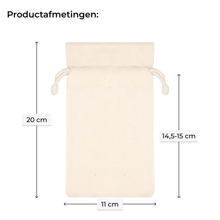 Elk zakje meet 11 × 20 cm en een verpakking bevat 10 katoenen zakjes.