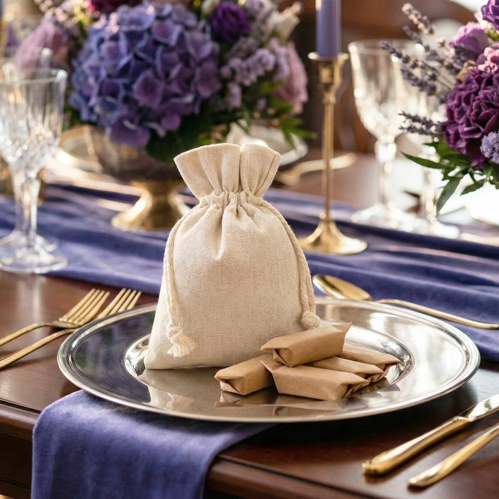 Linnen-look zakjes met lavendelborduursel - 10x13 cm, set van 10 - natuurlijke charme met een elegante twist
