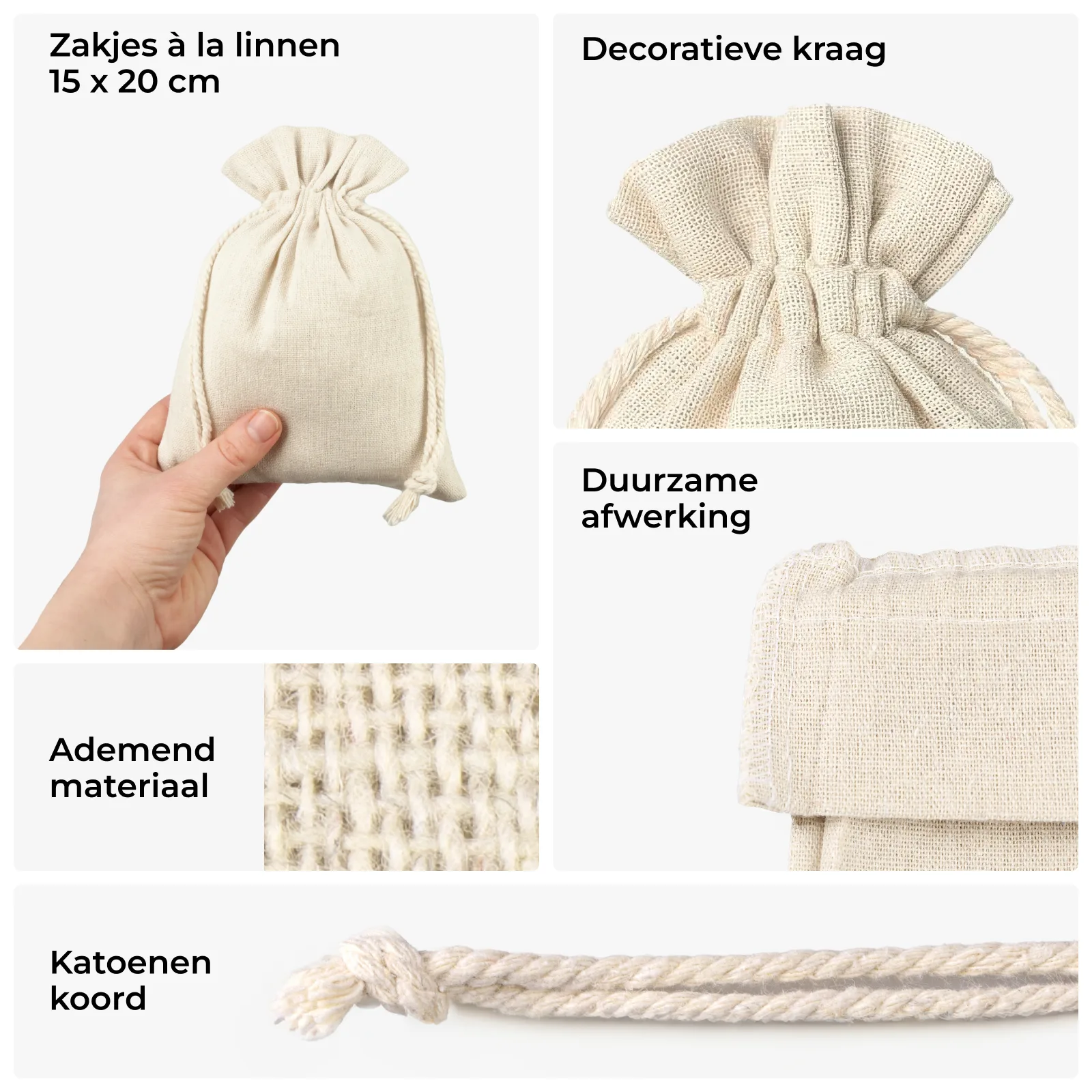 Bent u op zoek naar een organizer voor kleine huishoudelijke items? Of wilt u misschien unieke promotiegeschenken maken met het logo van uw bedrijf? In beide gevallen is de perfecte oplossing 15 x 20 cm linnen zakjes, die veelzijdig zijn in gebruik. Deze kleine trekkoordzakjes zijn gemaakt van hoogwaardig katoen-polyester stof die qua kleur, textuur en weefsel sterk lijkt op linnen. De combinatie van natuurlijke en synthetische vezels maakt onze à la linnen zakjes duurzaam, herbruikbaar en bestand tegen rekken en slijtage. De stof zorgt voor uitstekende luchtcirculatie en voelt prettig aan.