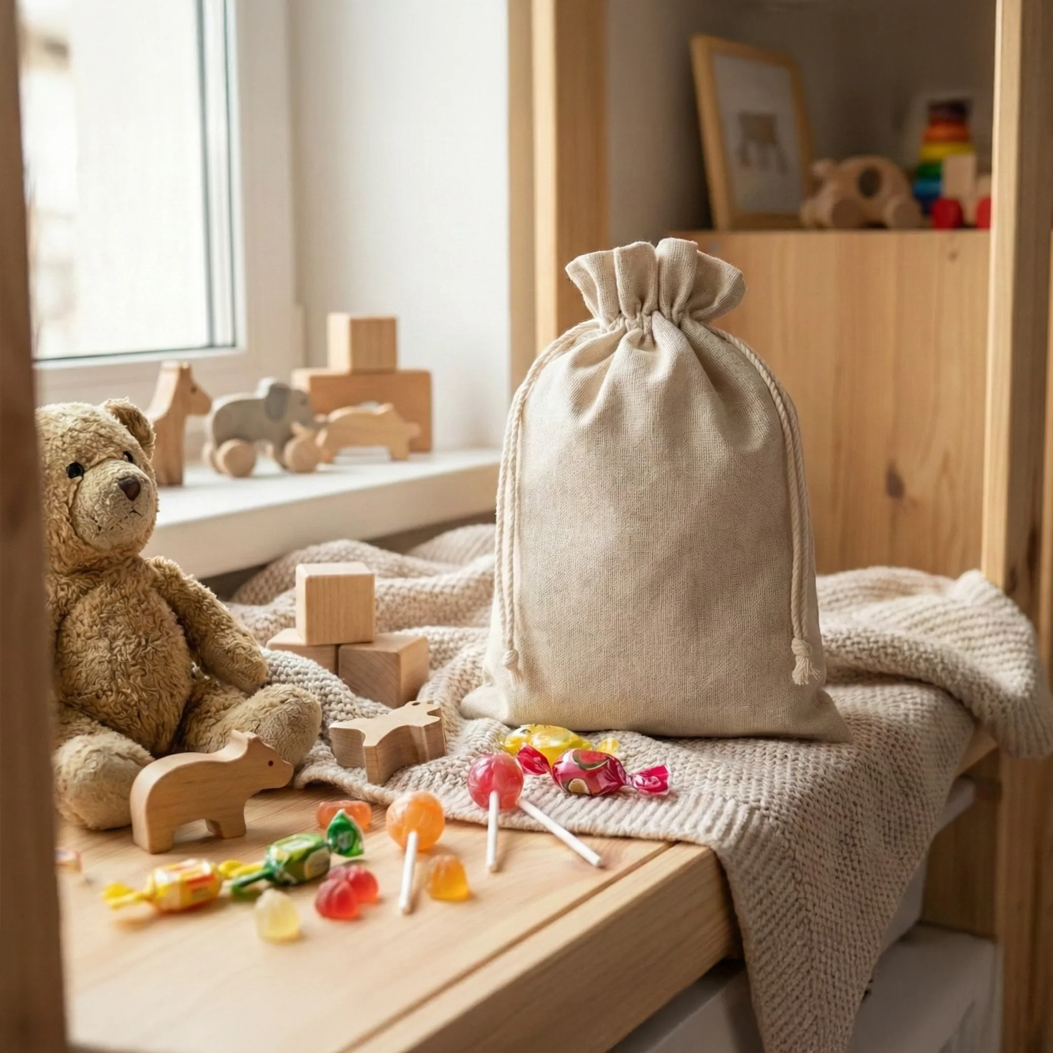 Wij hebben deze kleine tasjes gemaakt van aangenaam aanvoelend, luchtdoorlatend katoen met toevoeging van synthetische vezels. Deze stof ziet er heel chic uit - hij imiteert de textuur en de kleur van natuurlijk linnen. Het grote voordeel is de bovengemiddelde duurzaamheid ervan en de hoge weerstand tegen schuren en kreuken. Deze herbruikbare verpakkingen zijn de perfecte keuze!