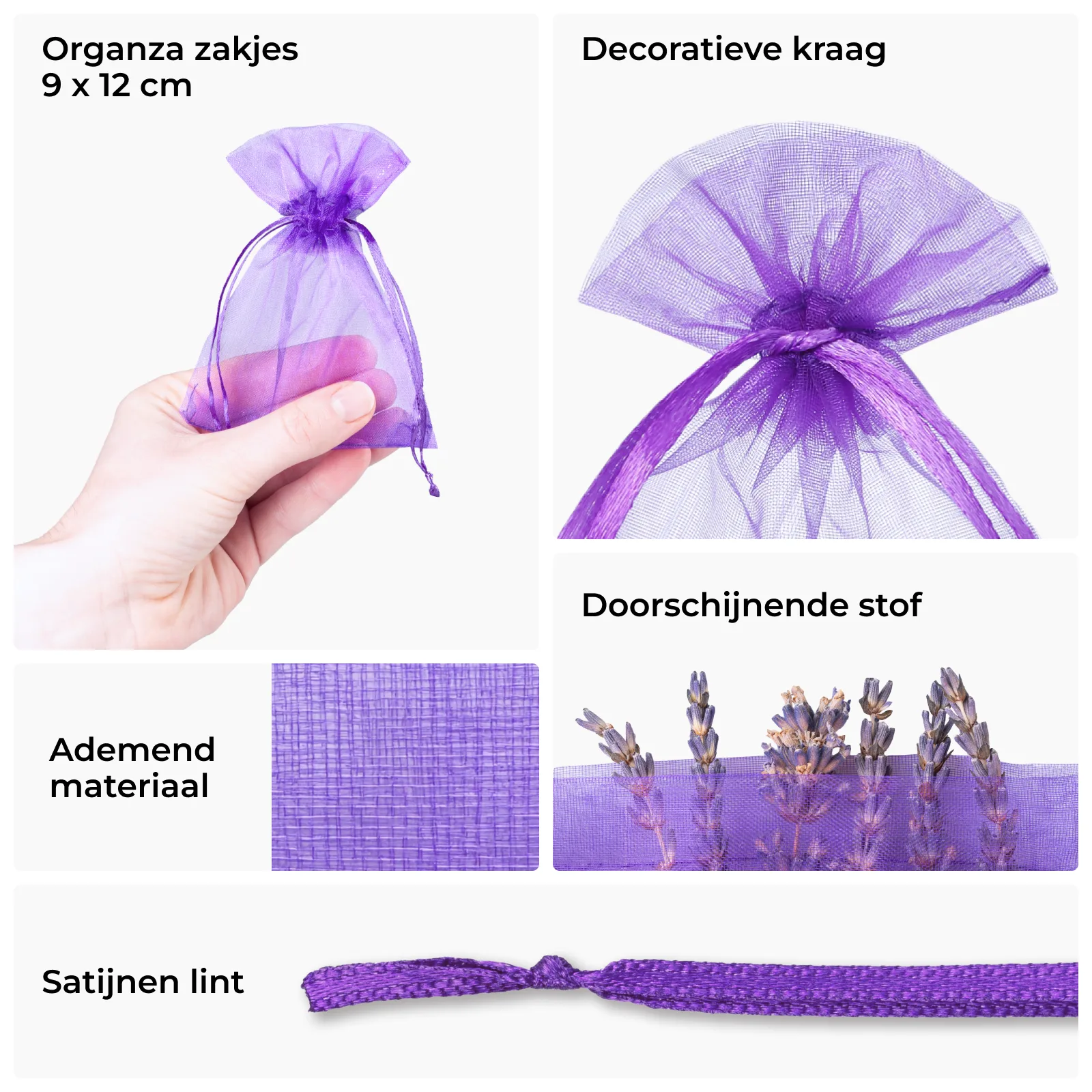 De zakjes zijn vervaardigd uit nylon organza - een fijne, ademende mesh-stof die geuren doorlaat en de inhoud zichtbaar houdt. De subtiele glans van de stof geeft het zakje een verfijnde uitstraling. Het dubbele satijnen koord zorgt voor een nette, herbruikbare sluiting en maakt het zakje handig in gebruik.