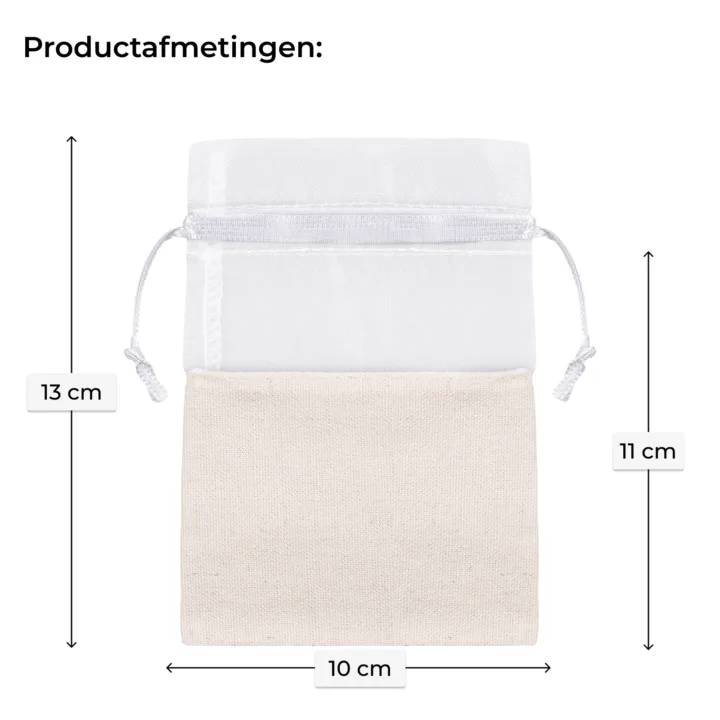 Deze elegante zakjes combineren het beste van twee werelden: transparante organza en een stevige, natuurlijke stof met linnen uitstraling (gemaakt van katoen en polyester). Het resultaat? Een charmant en veelzijdig verpakkingsmateriaal dat luchtig, herbruikbaar én visueel aantrekkelijk is.