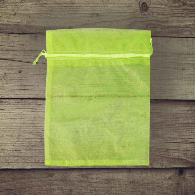 Een set van 10 stuks middelgrote organzazakjes in de kleur neon groen met afmetingen 18 x 24 cm. Ze worden ook tulen zakjes genoemd of zakjes van tule.