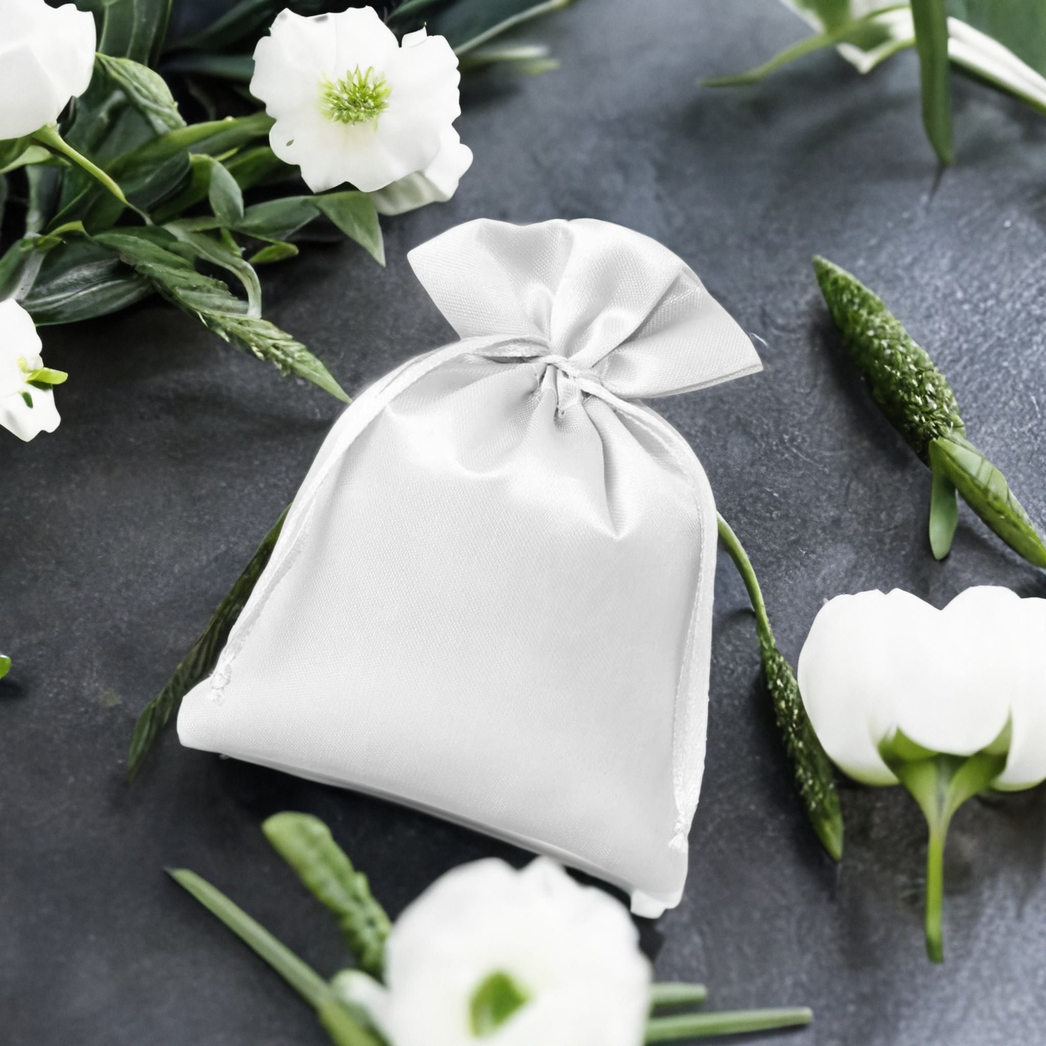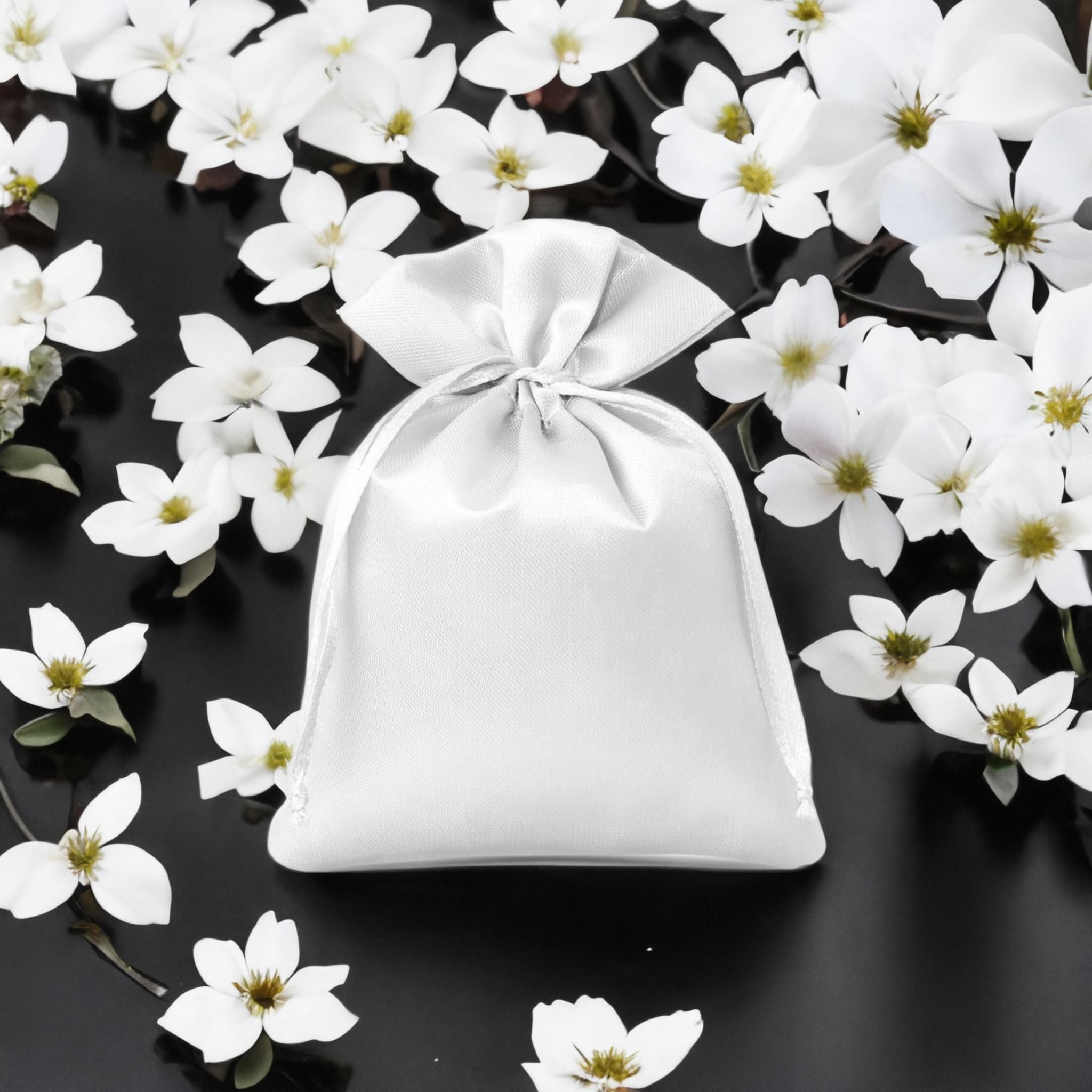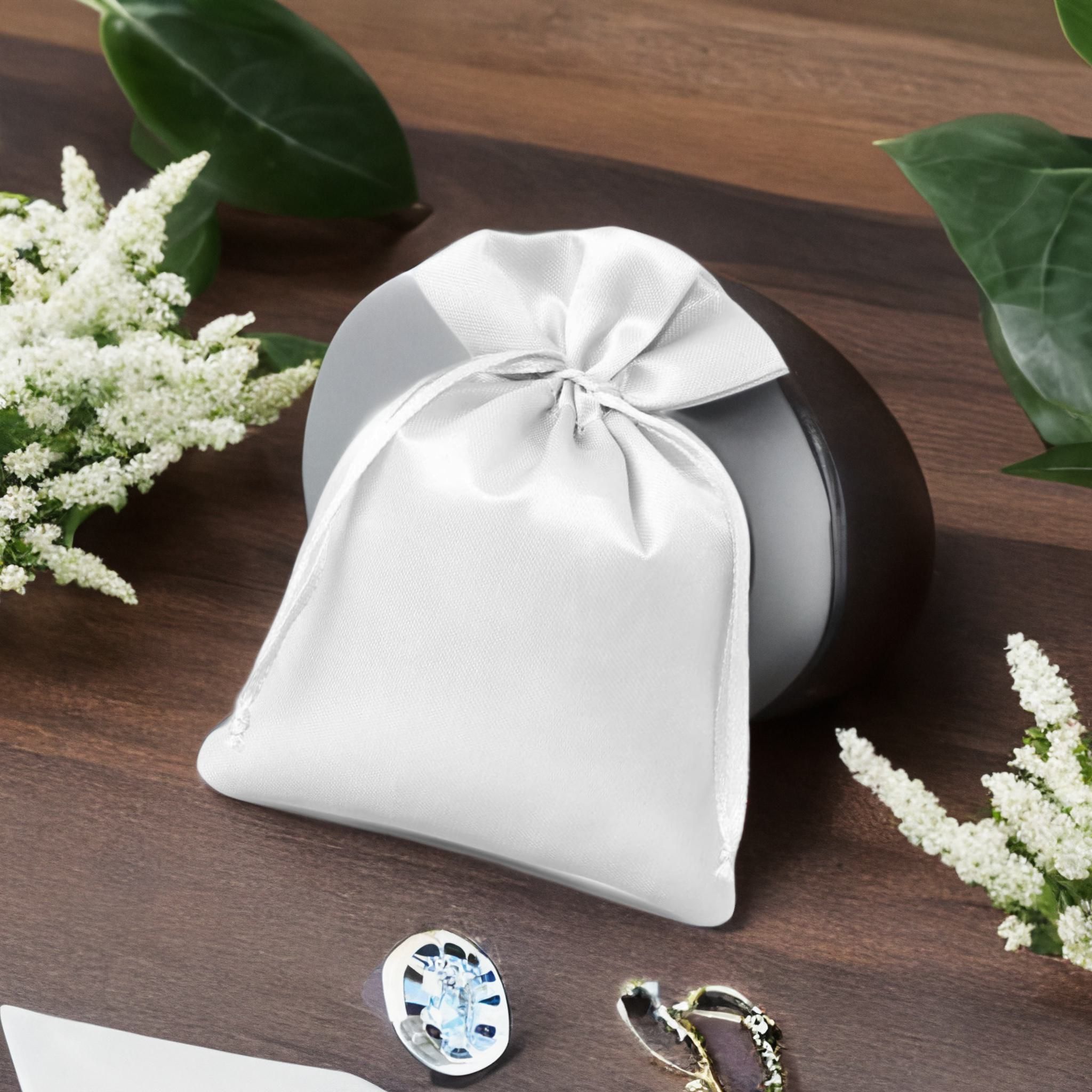 De satijnen zakjes 10 x 13 cm in het wit zijn verkrijgbaar in sets van 10 stuks. Hun elegante uiterlijk en functionaliteit maken ze de perfecte keuze voor verschillende gelegenheden.