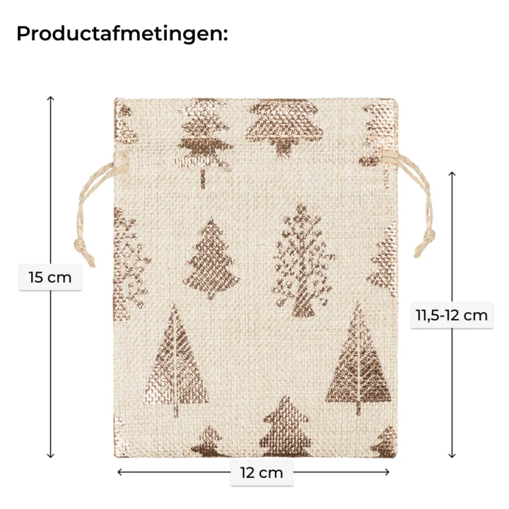 Deze jute zakjes van 12x15 cm in een zachte natuurlijke tint brengen direct een warme kerstsfeer met zich mee. Ze zijn versierd met een charmante kerstbomenprint en hebben een subtiele decoratieve kraag. Dankzij de binnenvoering van nonwoven stof blijven ze stevig en bruikbaar voor allerlei toepassingen - van geschenken tot brandingmateriaal.