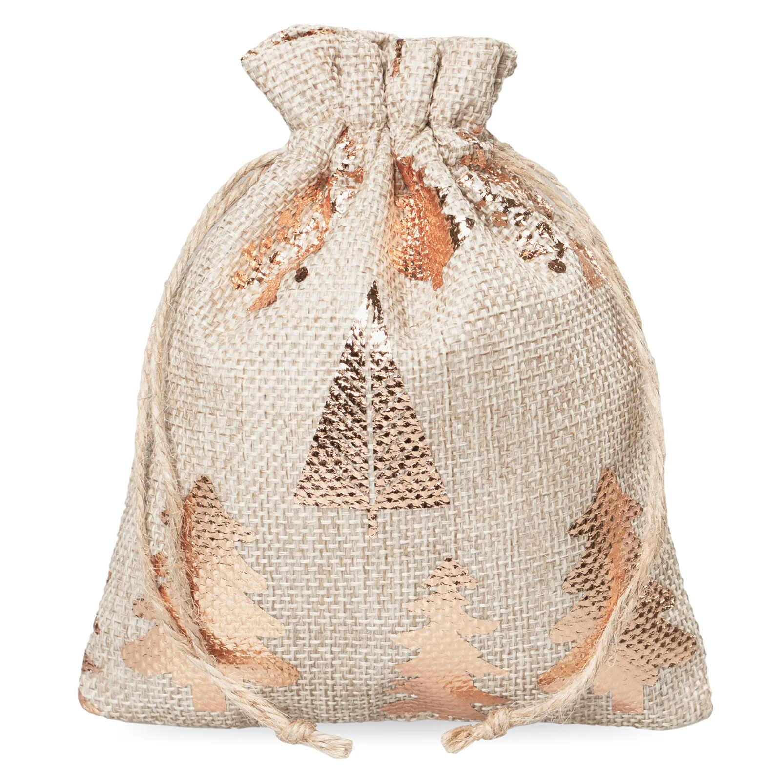 Deze jute zakjes van 12x15 cm in een zachte natuurlijke tint brengen direct een warme kerstsfeer met zich mee. Ze zijn versierd met een charmante kerstbomenprint en hebben een subtiele decoratieve kraag. Dankzij de binnenvoering van nonwoven stof blijven ze stevig en bruikbaar voor allerlei toepassingen - van geschenken tot brandingmateriaal.