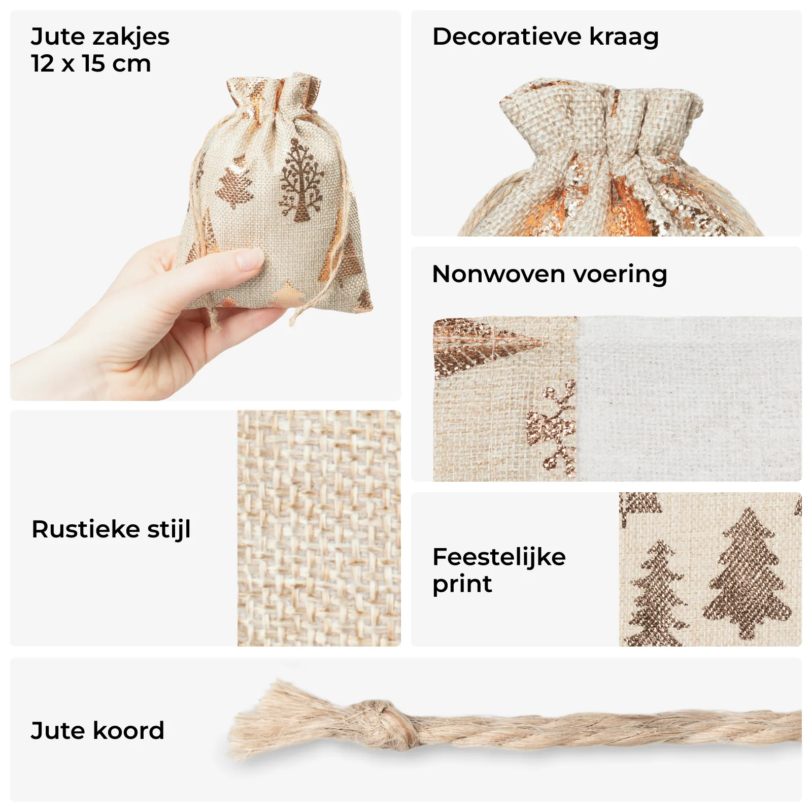 De rustieke uitstraling gecombineerd met de praktische sluiting met jutekoord maken deze zakjes tot een slimme en sfeervolle verpakking. Ze zijn herbruikbaar, stijlvol en maken van elk kleinigheidje een feestelijk moment.